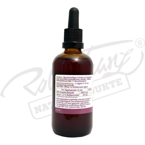 Inhaltsstoffe: 2ml (Tagesverzehr) enthalten 2400 mg Bio Grapefruitextrakt (= 0% NRV*), davon 1,2% (= 29 mg) Bioflavonoide (= 0% NRV*) * Prozentanteil der Nährstoffbezugswerte