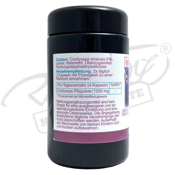 Inhaltsstoffe: 4 Kapseln (Tagesverzehr) enthalten 1200mg Cordyceps Pilzpulver (= 0% NRV*). *Prozentanteil der Nährstoffbezugswerte