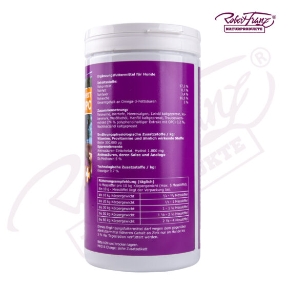 Zusammensetzung: Reiskeime, Bierhefe, Meeresalgen, Leinöl kaltgepresst, Rübenmark, Weißfischöl, Hanföl kaltgepresst, Traubenkernextrakt (74 % polyphenolhaltiges Extrakt mit OPC) 0,2 %, Nachtkerzenöl kaltgepresst