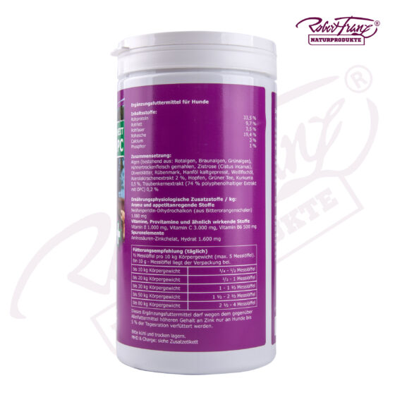 Zusammensetzung: Algen (bestehend aus: Rotalgen, Braunalgen, Grünalgen), Hühnertrockenfleisch gemahlen, Zistrose (Cistus incanus), Olivenblätter, Rübenmark, Hanföl kaltgepresst, Weißfischöl, Acerolakirschenextrakt 2 %, Hopfen, Grüner Tee, Kurkuma 0,5 %, Traubenkernextrakt (74 % polyphenolhaltiges Extrakt mit OPC) 0,2 %