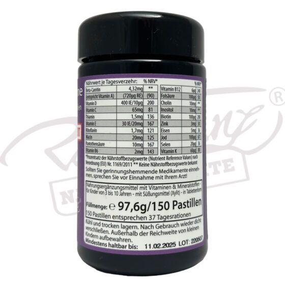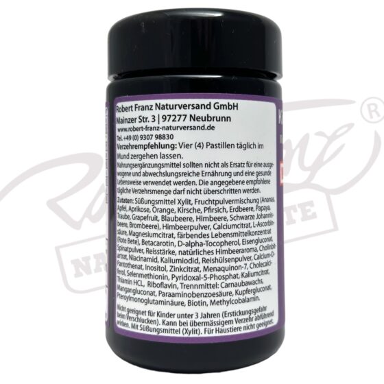 Zutaten: Süßungsmittel Xylit, Fruchtmischung (Ananas, Apfel, Aprikose, Orange, Kirsche, Pfirsich, Erdbeere, Papaya, Traube, Grapefruit, Blaubeere, Himbeere, Schwarze Johannisbeere, Brombeere), Himbeerpulver, Calciumcitrat,L-Ascorbinsäure Magnesiumcitrat, färbendes Lebensmittelkonzentrat (Rote-Beete), Betacarotin, D-alpha-Tocopherol (nat. Vitamin E), Eisengluconat, Spinatpulver, Reisstärke, natürliches Himbeeraroma, Cholinbitartrat,