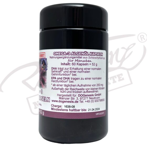 Einnahme: Pro Tagesdosis=2 Kapseln (1440mg Algenöl davon 576mg DHA und 288mg EPA) *Das Algenöl ist nicht standardisiert und unterliegt daher natürlichen Schwankungen.