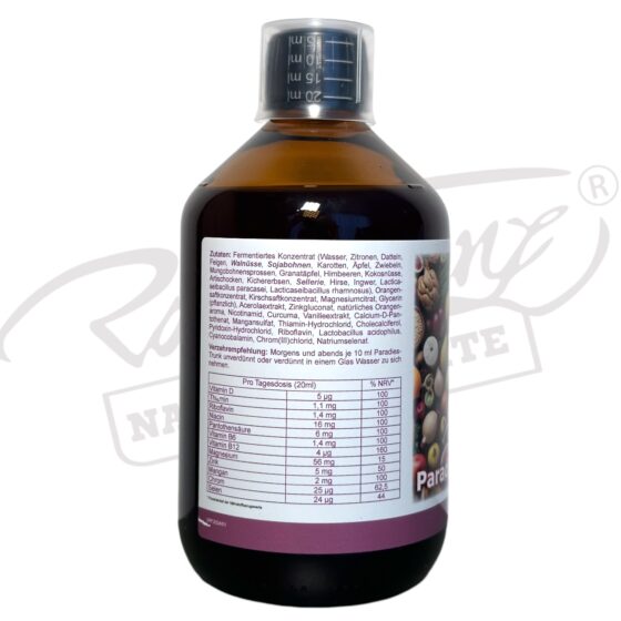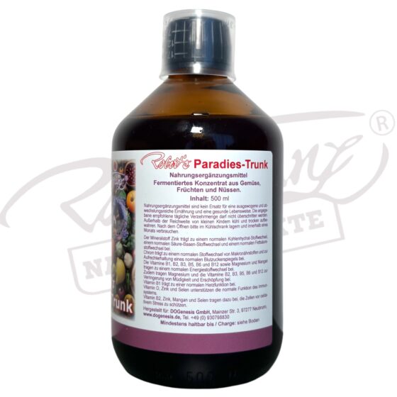 Verzehrempfehlung: Morgens und abends ja 10ml Paradies Trunk unverdünnt oder verdünnt in einem Glas Wasser zu sich nehmen