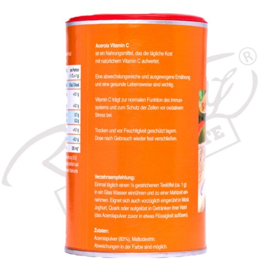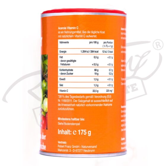 Acerola Vitamin C ist ein Nahrungsmittel, das die tägliche Kost mit natürlichem Vitamin C aufwertet. Eine abwechslungsreiche und ausgewogene Ernährung und eine gesunde Lebensweise sind wichtig. Vitamin C trägt zur normalen Funktion des Immunsystems und zum Schutz der Zellen vor oxidativem Stress bei.