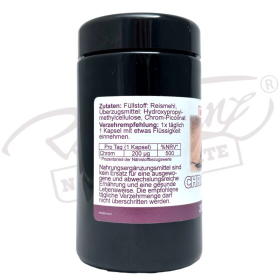 Inhaltsstoffe: Pro Kapsel befinden sich 200 mcg Chrom-Picolinat – %NRV* 500