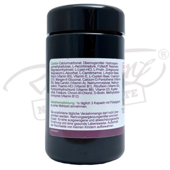 Zutaten: Calciumcarbonat, Kapselhülle Hydroxypropylmethylcellulose, Citrus Fruchtextrakt, L-Ascorbinsäure, Magnesiumhydroxid, L-Lysin-HCl, L-Prolin, L-Ascorbylpalmitat, Zinkgluconat, Magnesium-L-Ascorbat, L-Carnitintartrat, L-Arginin Base, Niacin (Vitamin B3), Vitamin E, L-Cystein Base, Coenzym Q10, Reismehl, Mangan-II-Gluconat, Calcium-D-Pantothenat (Vitamin B5), Beta Carotin (Vitamin A), Natriummolybdat, Natriumselenit, Thiamin-HCl (Vitamin B1), Riboflavin (Vitamin B2), Pyridoxinhydrochlorid (Vitamin B6), Vitamin D3, Kupfercitrat, Folsäure, Chrom-III-Chlorid, D-Biotin, Methylcobalaminhydrat (Vitamin B12)
